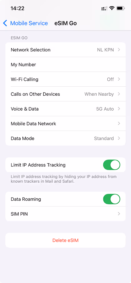 Gå til Innstillinger > Mobilnett, trykk på eSIM, og velg Slett eSIM.